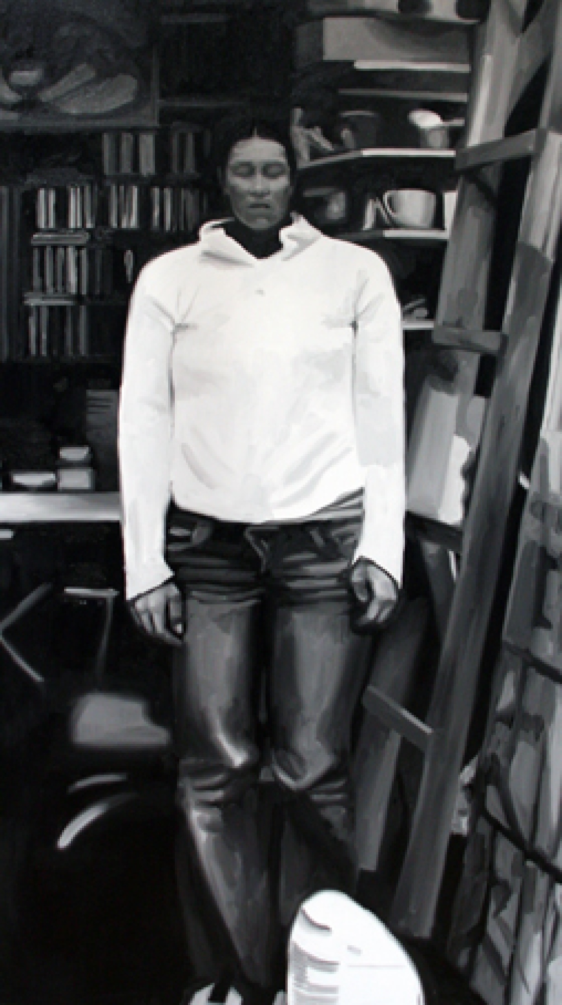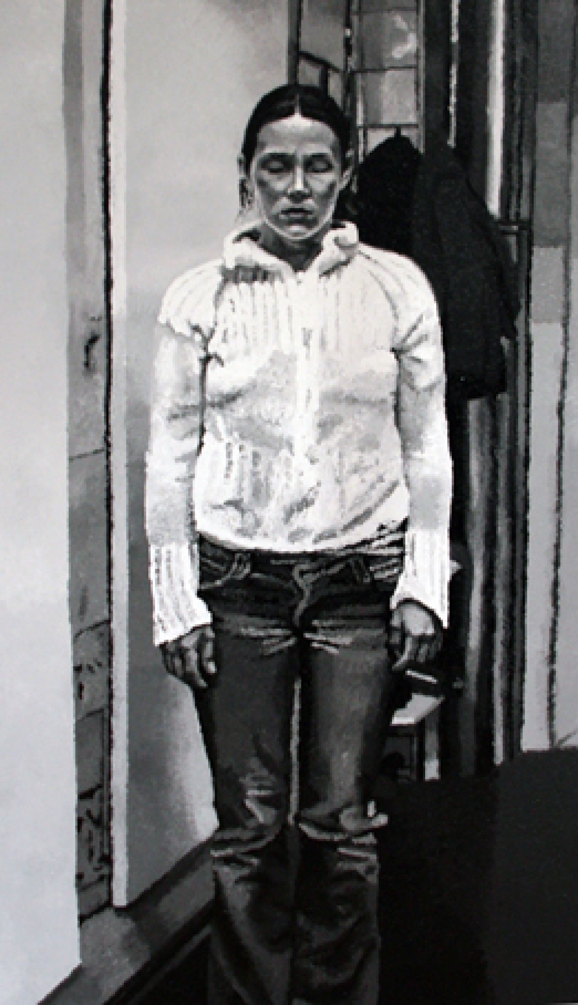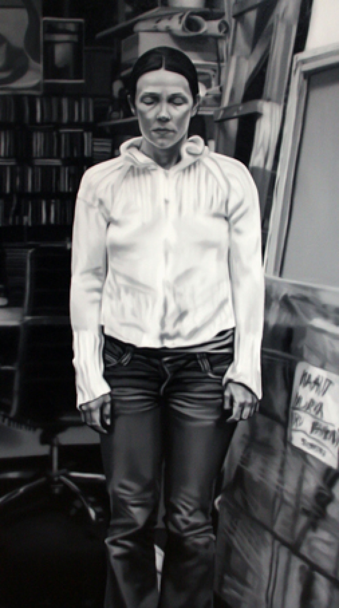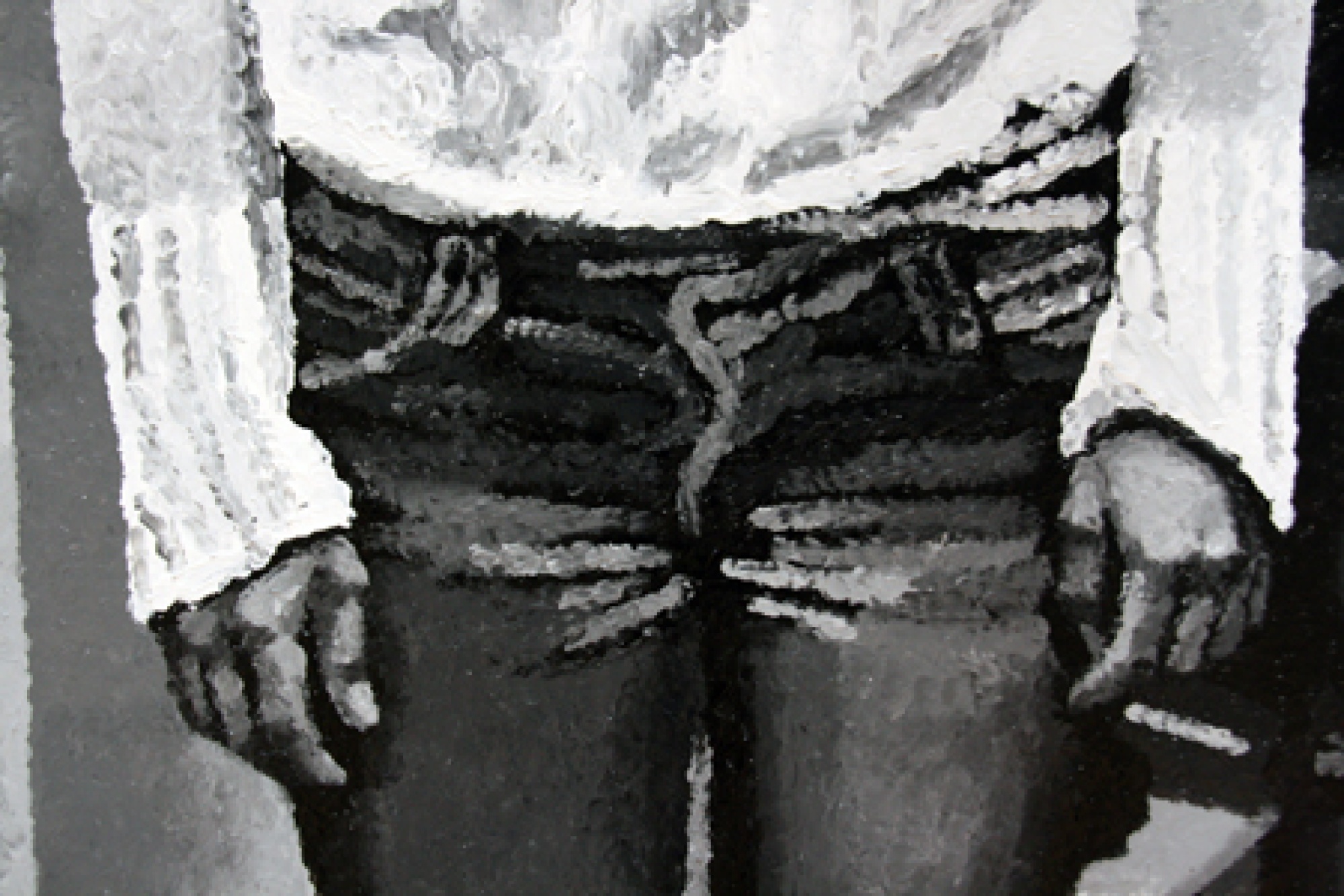 Art science offers much more possibilities than does conventional dry scientific science. A dangerously non-scientific result was received by Maarit Murka by suppressing the sense of balance and also all other senses by using alcohol, so that the breathalyser showed 0,43. In this painting we can’t see the gloominess that is so characteristic of Murka, she is smiling through an impressionistic mist, as much as impressionism can be possible in a black-and-white painting. Is it that for Murka the breathalyser is also a mentalyser? As already told, as a snack she used one of her paintings, when she licked the oil paint off a freshly painted canvas. The movement of the tongue gives the painting texture like the petals of a chrysanthemum. Video shows the process itself. Maarit Murka also has companions of taste, for example Ani K. from the Republic of Thailand has painted Mahatma Ghandi on a cross and Osama bin Laden in a cave by sticking his tongue in paint, the video is also visible on YouTube. When googleing paint licking you can only get to pages about safety and porn - maybe Murka is the first in the world to do something like that. If you ask two people to shake hands for five minutes, then usually they estimate the time to be longer, but exchanging kisses always takes less time. Maybe one of the kissers had eaten garlic and the other licked paint. And as we already mentioned exchanges, then we cannot leave unmentioned the exchange auction held in Tamm gallery, curate by Maarit Murka. This is an auction where pictures are not bought and sold for money but exchanged with each other. Why can’t a piece of art be measured by a TV? Politicians offer themselves on advertisement posts, carrying signs „exchange“. An elementary demand for every science is finding the right equivalent.