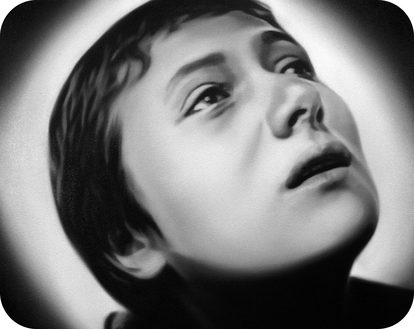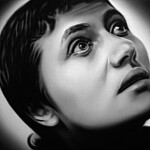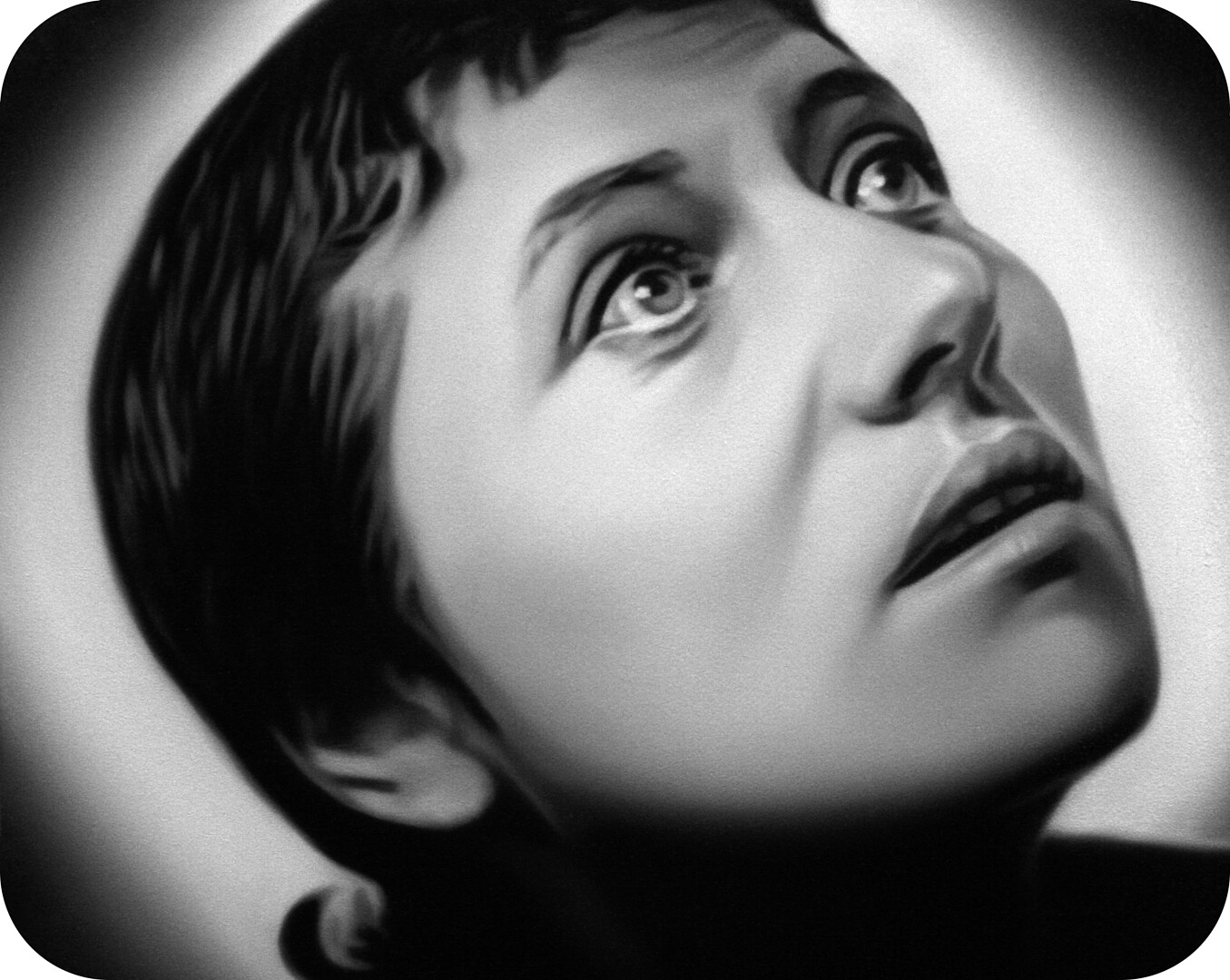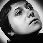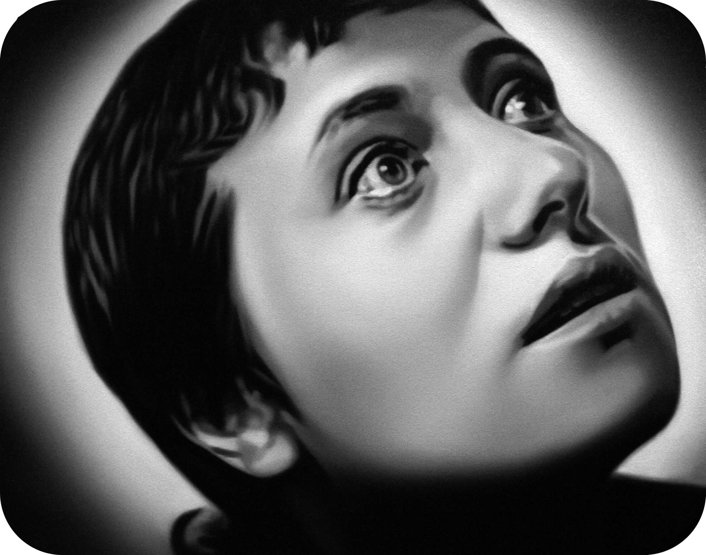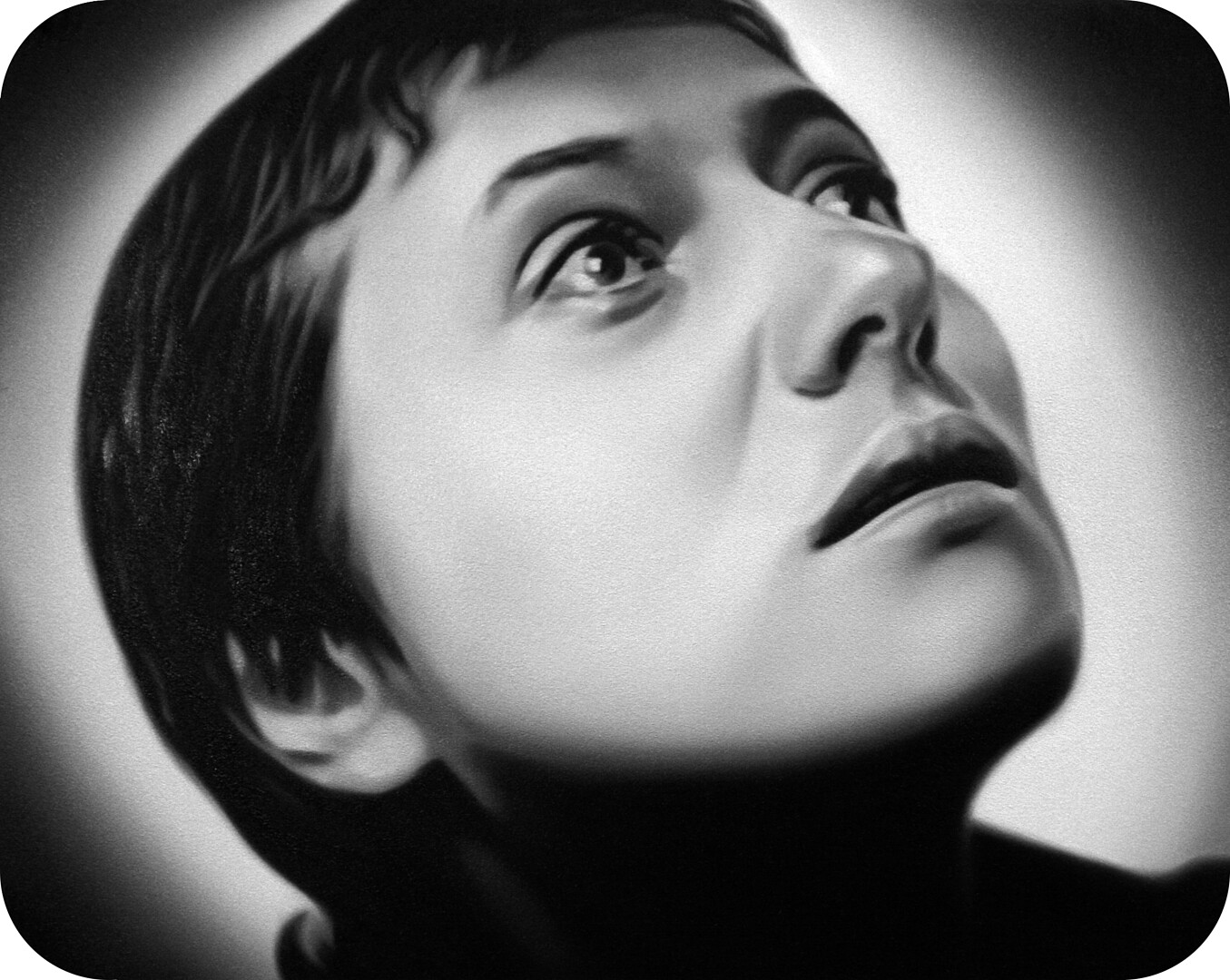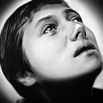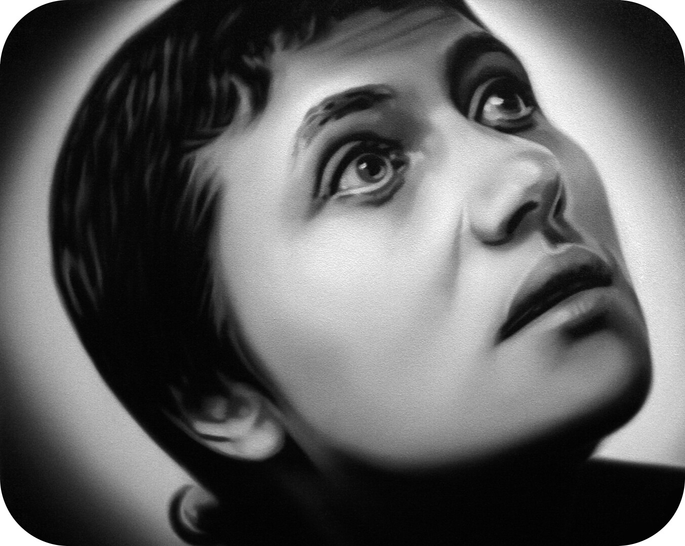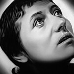 Murka’s series of paintings depicts moments from the 1928 movie „The Passion of Joan of Arc", where the hair of the heroine is cut off before execution. This is a motive of humiliations and the violent suppressing of the personality as is explained in the cover letter of the exhibition written by Ellu Maar. Here we can see the difference between forced and voluntary cutting of hair, where the latter is seen as rebirth.
