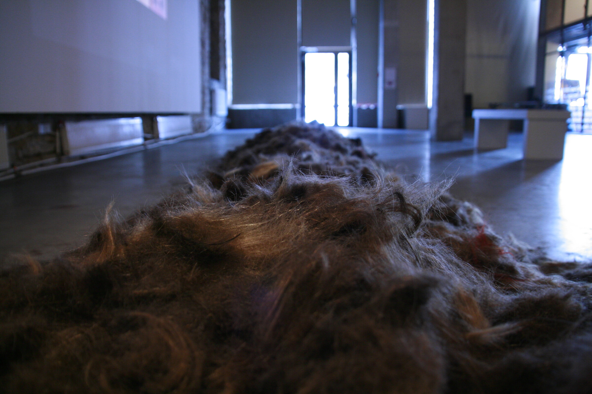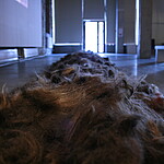 Maarit Murka demonstrates hair-fetish along with cut-off hair horror. In the video the ritual hair cutting of the family ends with rolling around in cut off hair, that sticks to the face and body of the artist. On the floor of the gallery there are piled up hair collected from hair saloons - that is the dead hair.